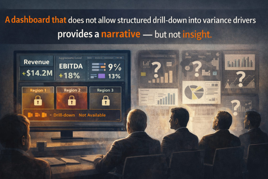 A dashboard that does not allow structured drill-down into variance drivers provides a narrative but not insight.